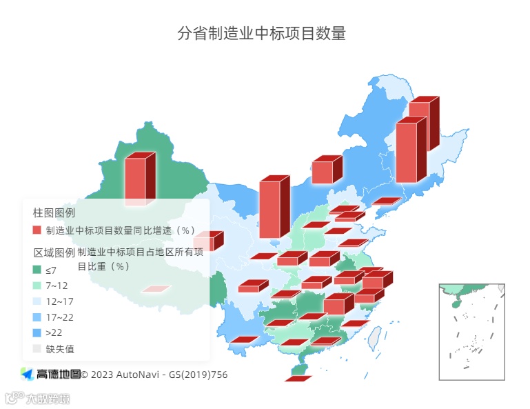 各地“制造业当家”战略带动效应显著。近年来,各地对制造业的重视和回归成为大趋势,多地出台相关规划与政策重新扶持制造业,推动传统与新兴产业协同发展。比如,2023年6月,广东省出台“制造业当家22条”,明确了2027年制造强省建设迈上重要台阶、2035年全面建成制造强省的战略目标;上海市发布《上海市推动制造业高质量发展三年行动计划(2023-2025年)》,其中提到要高标准建设特色产业园区,加快向集群化、生态化、融合化发展。各地产业发展政策、工业投资、数字化技改等效应持续释放,为制造业投资扩张创造了有利条件。2023年上半年,广东、江苏、山东、浙江、上海等工业强省项目数量同比增速分别达到30.5%、30.6%、29.6%、53.2%、69.4%;辽宁、吉林、内蒙古、宁夏、云南、河北、湖北、青海、河南、福建、四川、甘肃、山东、黑龙江、天津、陕西等16个省市制造业中标项目数量占当地所有项目的比重超过10%。特别是装备制造业领域,上半年,全国电气机械和器材制造业、计算机通信和其他电子设备制造业、汽车制造业、铁路船舶航空航天和其他运输设备制造业、通用设备制造业、仪器仪表制造业、专用设备制造业等7个相关行业中标项目数量同比增长57.2%,较上年同期加快32.5个百分点;中标项目金额同比增长59.3%,较上年同期加快41.3个百分点。
