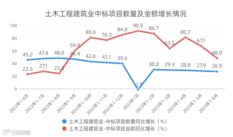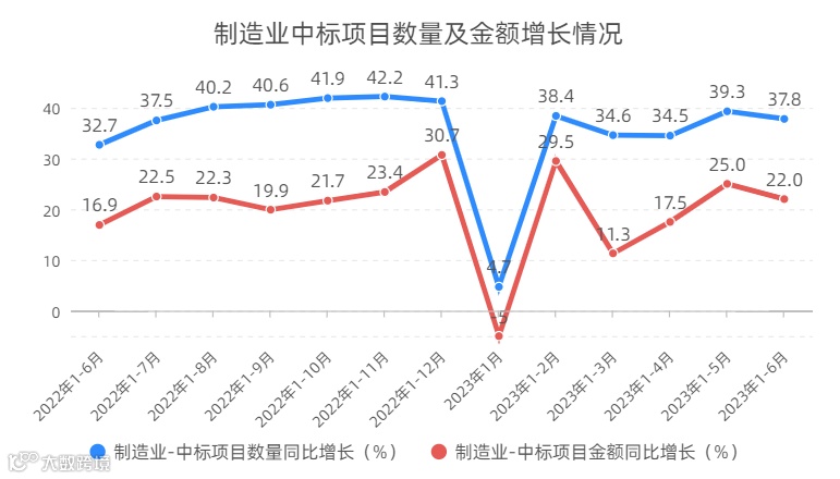 招投标大数据显示项目建设稳步落地。2023年上半年,全国中标项目数量实现19.4%的较快增长。但二季度以来,国内经济实际复苏动能有所回落,市场主体的投资意愿与能力也受到一定影响,上半年中标项目数量增速较一季度回落4.9个百分点。从资金保障看,专项债券在拉动有效投资中的积极作用继续发挥。今年以来,各地加快专项债券发行使用节奏。数据显示,2023年上半年,各地发行用于项目建设的专项债券21721亿元,支持地方建设实施一大批惠民生、补短板、强弱项的项目。同时,去年两批金融工具合计投放7400亿元,有力补充了一批基础设施等领域重大项目资本金。人民银行《2023年第一季度中国货币政策执行报告》表示,持续发挥政策性开发性金融工具的作用,增强政府投资和政策激励的引导作用。上半年,全国中标项目金额实现40.5%的高速增长,与一季度相比仅小幅下滑1.0个百分点,明显快于全国固定资产投资3.8%的增速。