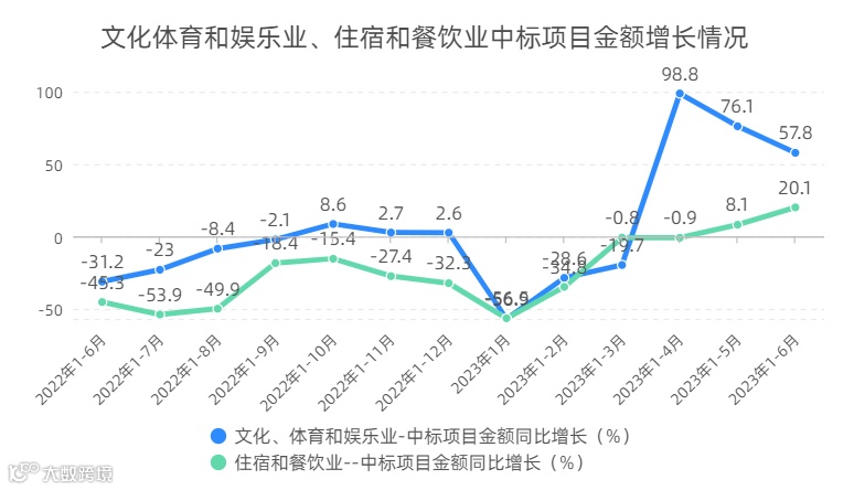 文旅、餐饮等市场蓬勃复苏,行业投资活力持续释放。今年疫情平稳转段以来,随着消费场景逐步恢复,前期受疫情影响较大的文旅、餐饮等线下服务业复苏明显加快。同时,在暑期消费旺季来临、促消费政策力度加大等多重积极因素下,消费相关产业预期向好。上半年,文化体育和娱乐业、住宿和餐饮业的中标项目金额分别增长57.8%、20.1%,较一季度分别加快77.5、20.9个百分点。同时,在疫情期间不断涌现的线上新业态新模式,在经济社会全面恢复常态化运行以后,继续与线下消费场景融合,网上零售、直播带货等新服务模式较快增长,为服务业发展注入新动力。比如,在新基建领域,采购人属于文化体育和娱乐业、住宿和餐饮业的项目中标金额分别增长411%、15.7%。