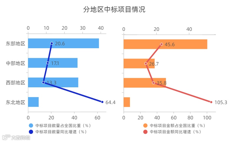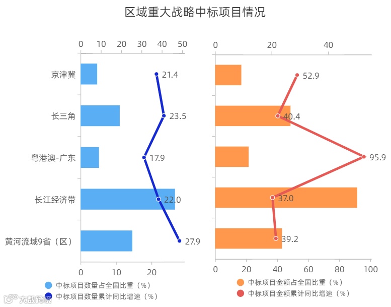 东部地区领先优势进一步巩固,中西部地区支撑能力稳步提升。2023年上半年,东部地区中标项目数量、金额分别占到全国总量的39.1%、51.2%,占比均位居四大板块首位;同比分别增长20.6%、45.6%,增速均仅次于东北地区位居第二位。中部和西部地区中标项目数量合计占比已超过一半(55%),同比分别增长17.1%、13.3%,项目金额占比合计达到44.9%,同比分别增长26.7%、35.8%。东北地区项目投资也在持续加码,加上去年基数较低影响,中标项目数量、金额实现64.4%、105.3%的高速增长。动力源地区引擎作用持续加强。上半年,京津冀三地、长三角三省一市、广东省中标项目数量合计占比近四成(36.5%),较上年同期进一步提升0.7个百分点,分别实现21.4%、23.5%、17.9%的快速增长;中标项目金额合计占比近一半(47.9%),同比分别增长52.9%、40.4%、95.9%。