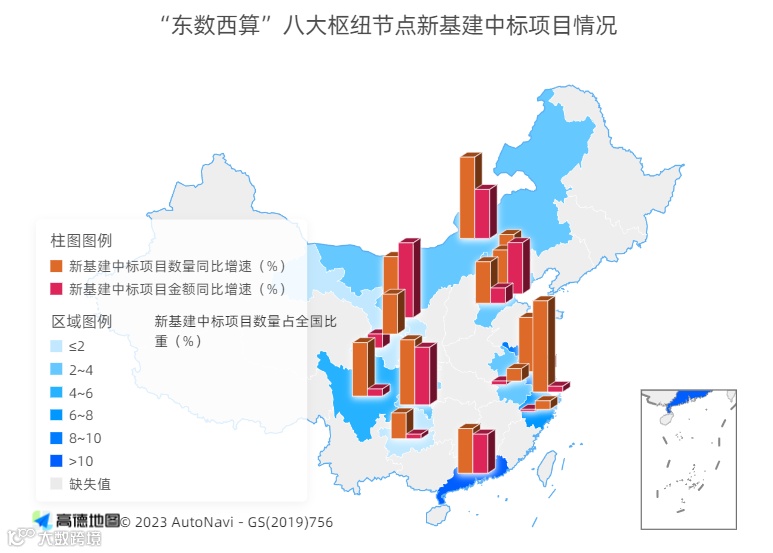 “东数西算”对相关省市新基建投资带动作用明显。算力已成为推动地区经济增长重要的驱动力。随着“东数西算”工程进入加速期,各地加速推进网络设施与算力设施配套部署,进一步优化升级网络体系架构,打造满足各类算力应用需求的运力体系。2023年上半年,京津冀三地、长三角三省一市、广东省等三大动力源地区新基建中标项目数量占比合计达到44.7%,分别实现156.3%、121.7%、107.6%的高速增长。八大国家算力枢纽节点中,东部的广东、江苏、浙江三省新基建中标项目数量占全国比重分别达到10.9%、8.8%、6.4%,同比分别增长107.6%、196.3%、49.8%;中西部地区项目建设持续加快,内蒙古、四川、甘肃、重庆、宁夏、贵州、安徽等省区新基建中标项目数量增速分别达到219.2%、209.8%、176.7%、150.7%、145.7%、105.5%、65.4%。