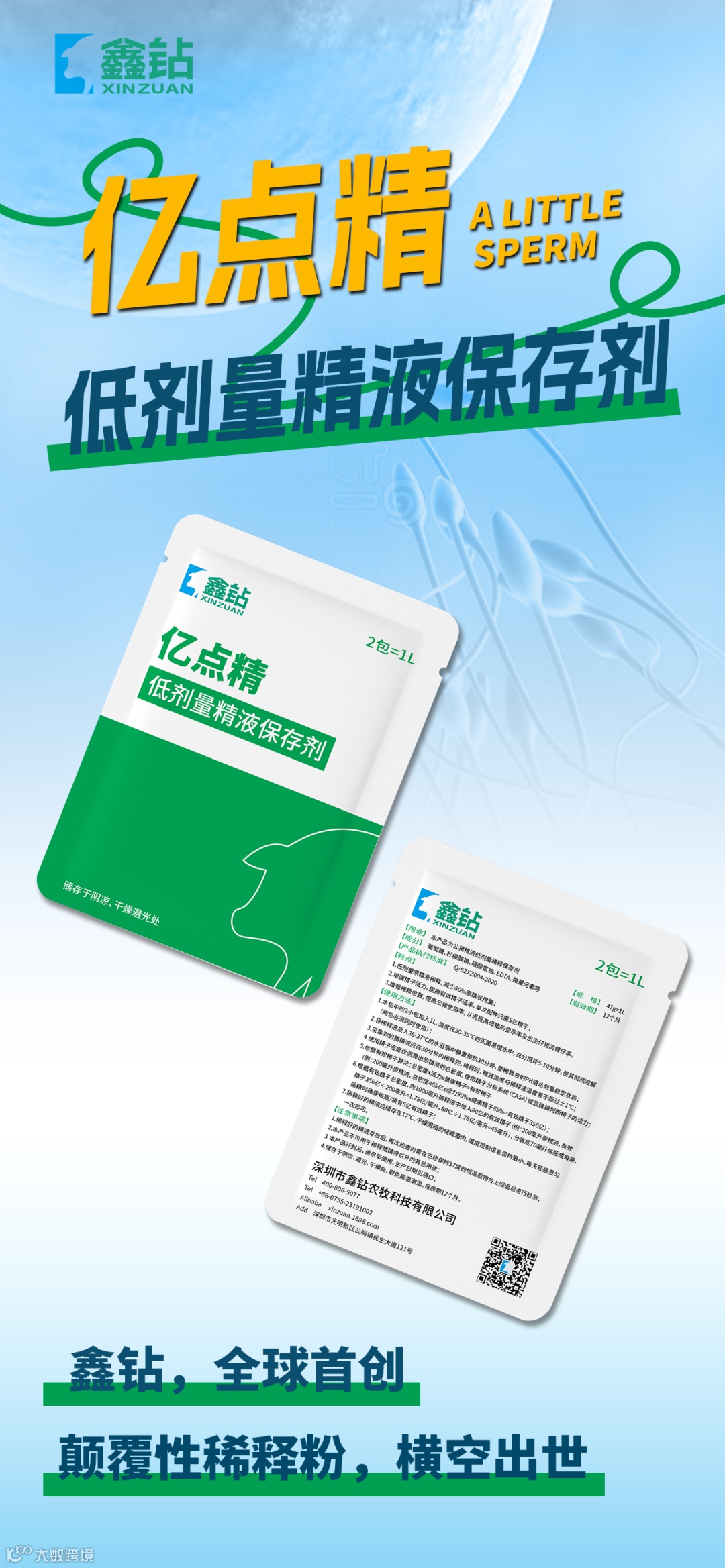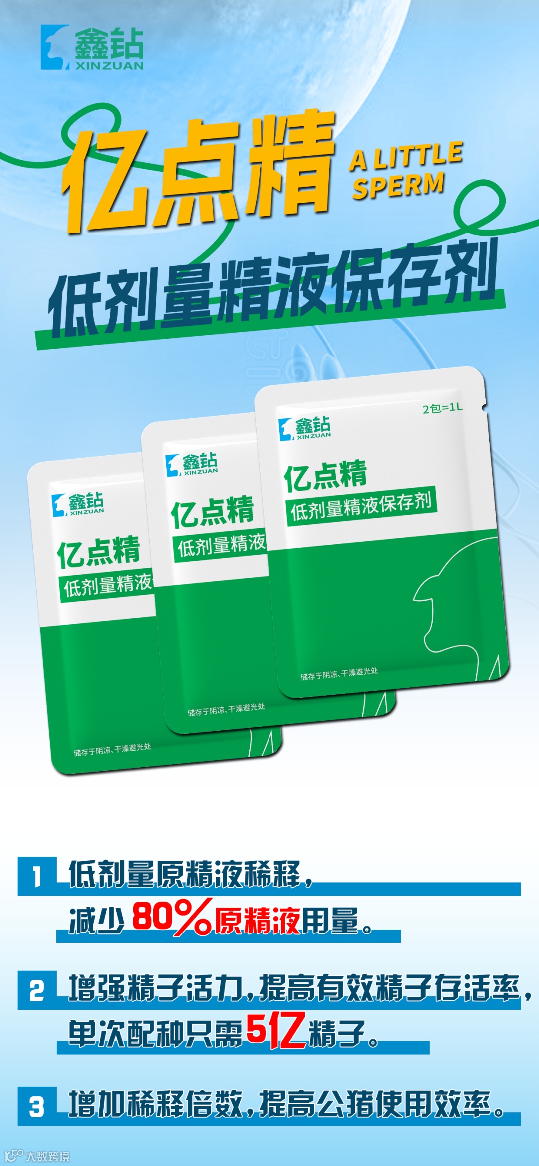 鑫钻经过五年研发,革命性的推出亿点精低剂量精液保存剂,可以减少80%的精液用量,单次配种只需要5亿就可以达到输精效果,大大的提高了公猪的利用率,减少了精液浪费,同时让高品质的公猪降低成本,为广大的养殖户提供更优质的公猪精液,从而提高母猪的分娩率及出生仔猪的健仔率。