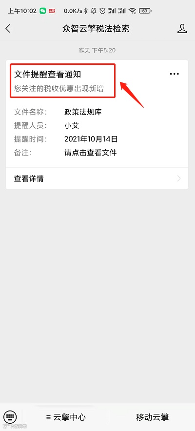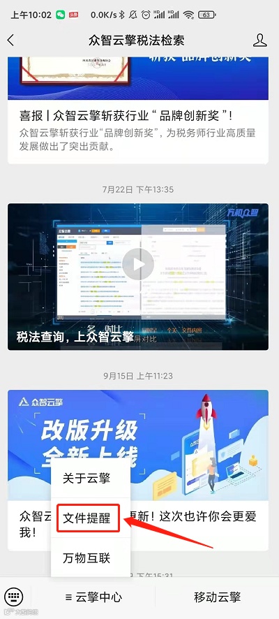 第一步:在手机上打开官方公众号:众智云擎税法检索,点击云擎中心的“文件提醒”。