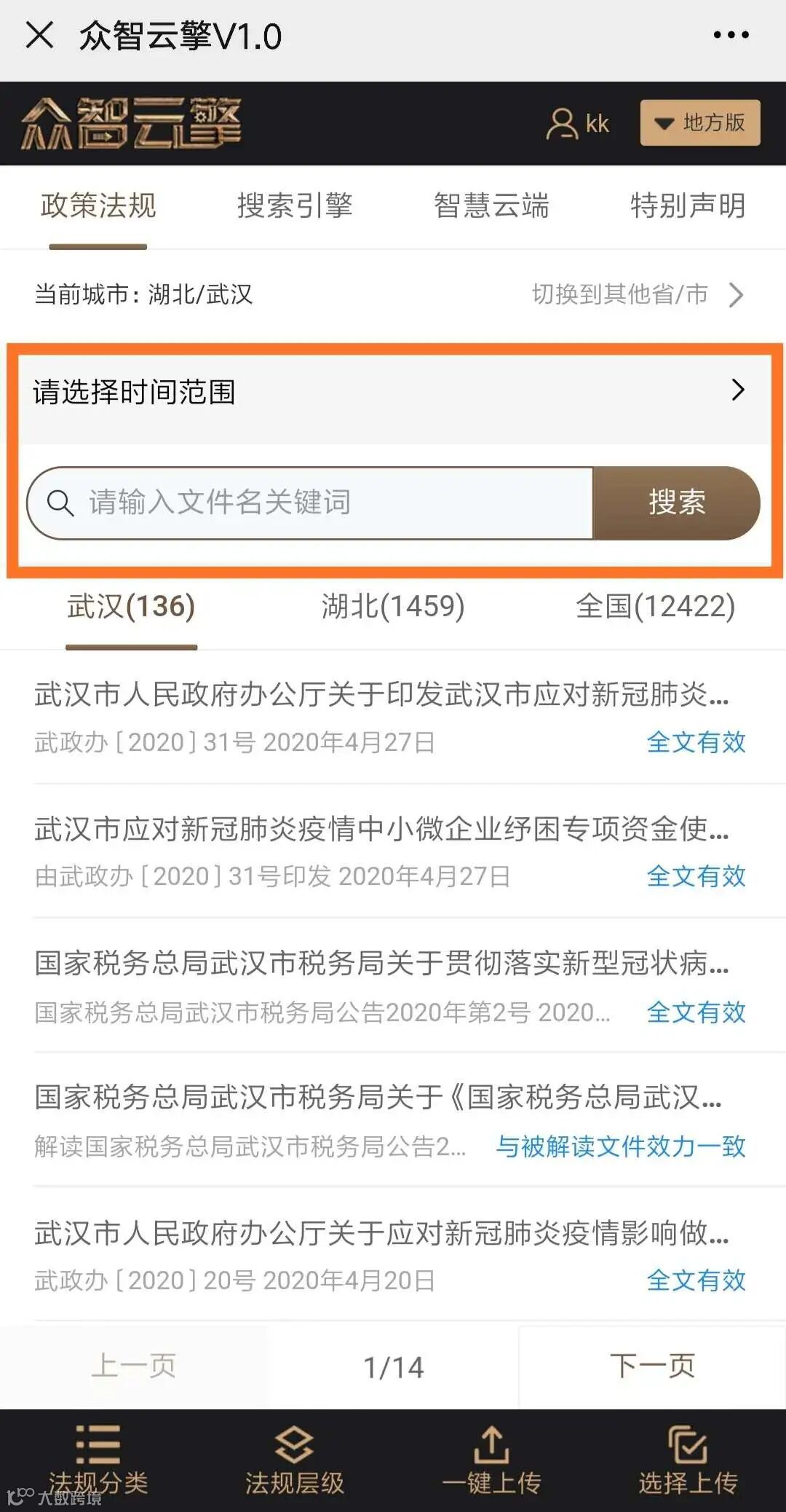 比如我在成都,想要查询武汉的相关文件,可以手动选择定位到“湖北-武汉”,定位完成后显示的文件法规有三个层级,分别是“武汉”、“湖北”、“全国”,并在后面括号内显示相应的法规文件数量: