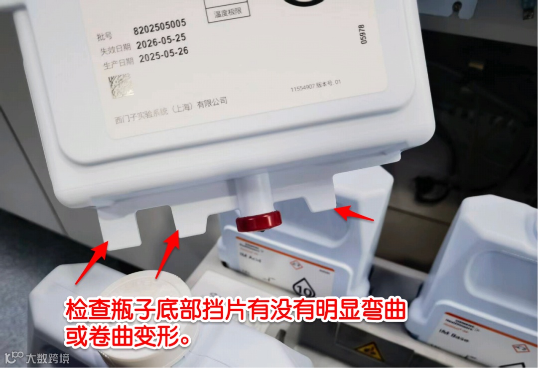 Atellica液体耗材更换后,隔十来分钟后又报红。这种情况大部分是由于底部钢针没有刺穿封口,液体没有流下去导致。