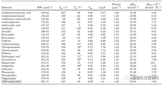 JARED A. BAIRD等人对51个有机分子进行了过冷状态下熔体的结晶趋势研究。实验将样品以10°C/min加热至过熔点约10°C,保温3min。然后以20°C/min的速率降温至-75°C。最后再以10°C/min的升温速率加热至过熔点。结果显示,在51个分子中,有23个在冷却过程中发生结晶,即为class I化合物。11个在再次加热过程中结晶,即为class II化合物。有17个没有结晶,即为class III化合物。相比于目前在研的小分子新药,该研究中class I和class II的比例是比较高的,这可能是因为研究人员选取的化合物分子量相对较小,只有200-300g/mol左右。而目前在研的药物分子,分子量大多在500g/mol左右。