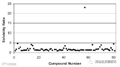 作者统计了55个化合物共81个溶解度比值(同一个化合物可能有多个晶型,其他晶型溶解度和稳定晶型溶解度的比值可能不止一个),统计的结果如下图所示。其中X轴是样品编号,Y轴是不同晶型溶解度的比值。