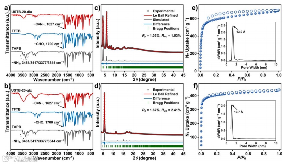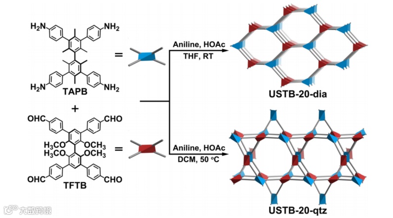 TFTB 和 TAPB 在不同条件下进行以下缩合。在四氢呋喃(THF)中室温反应10天得到淡黄色块状USTB-20-dia单晶;而在二氯甲烷(DCM)中50℃反应2天得到白色的USTB-20-qtz。