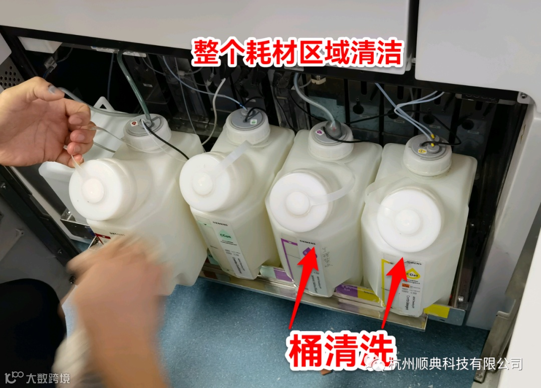 三、清洁各消耗品桶及放置区域(Buffer2/BathOil/CC/Diluent/CD),以及清洗Diluent/CD桶。(整个区域清洁,包括擦拭所有瓶子外表面。找干净的空瓶子,将Diluent/CD倒入干净空瓶子,将Diluent/CD桶用去离子水洗干净后,甩干水,将原液体倒回桶内,做所有液体的PRIME10次)