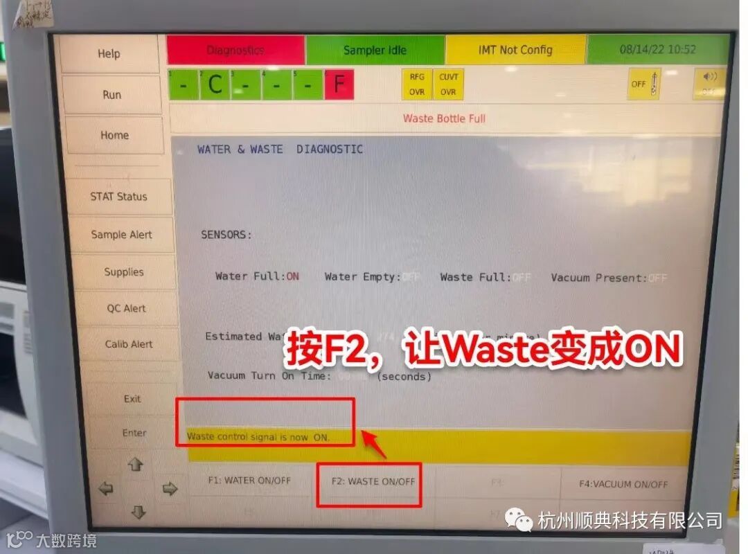 杭州顺典科技有限公司当碰到Waste Bottle Full报警时,应急处理方式:进F7F1F6界面,先按两次F4把Vacuum关闭,再按F2把Waste打开,此状态保持4分钟后退出界面,Reset一下,继续使用仪器。同时通知工程师处理,因为这样只是应急处理,后面还是出现同样的报警。
