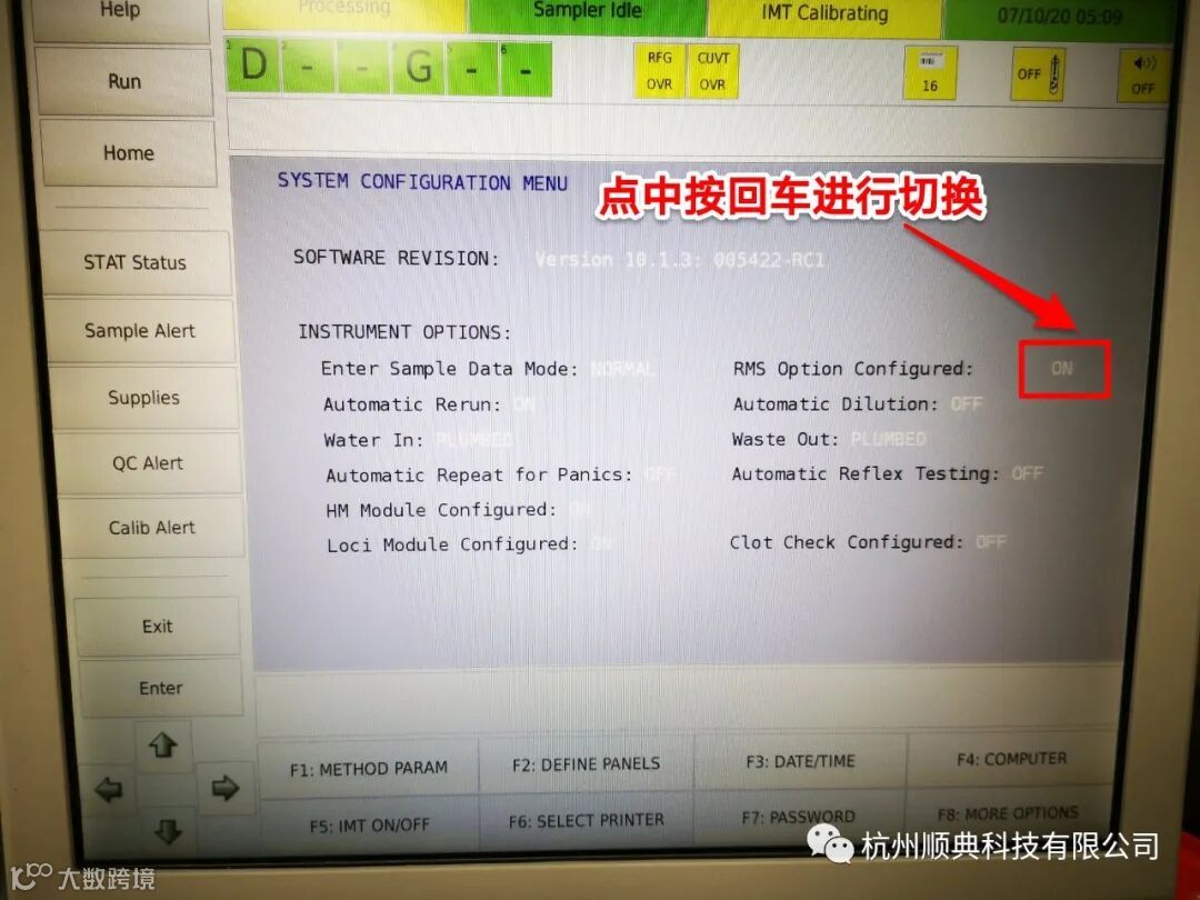 当Dimension EXL中的RMS模块有报警,且短时间处理不好的情况下,可以先把RMS模块关闭,先正常使用仪器。关闭步骤:F6界面,点中RMS Option Configured后面的ON,按回车键切换成OFF。