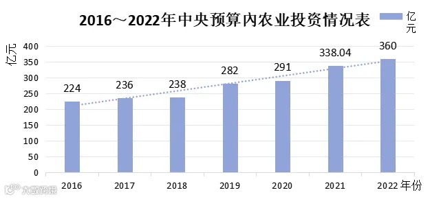 从“十三五”时期开始中央预算内投资农业建设项目的总规模呈现出快速增长和重点支持的态势和特点。尤其从2018年机构改革以来,投资规模更是大幅增长,如2019年较2018年增加了44亿元,增幅达到18.5%;而到了2021年,投资规模更是达到了338亿元,比2020年增加了48亿元,增幅为16.49%,到了2022年,投资规模仍在持续增长。根据相关政策文件和规划,中央预算内投资在农业建设项目上的投入力度将持续加大。