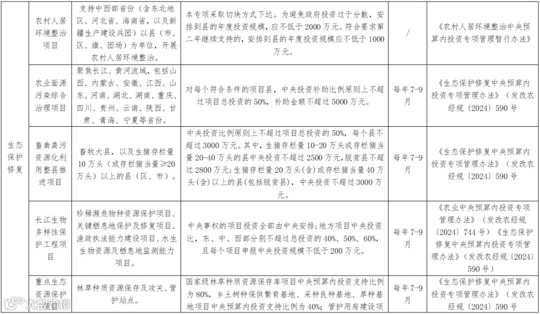 生态保护修复类项目主要围绕农村环境、农业污染两方面展开的,项目谋划方向为农村人居环境整治、农业面源污染综合治理、畜禽粪污资源化利用整县推进、长江生物多样性保护工程、重点生态资源保护、林业行业及执法能力建设、草原畜牧业转型升级、节能降碳等项目。