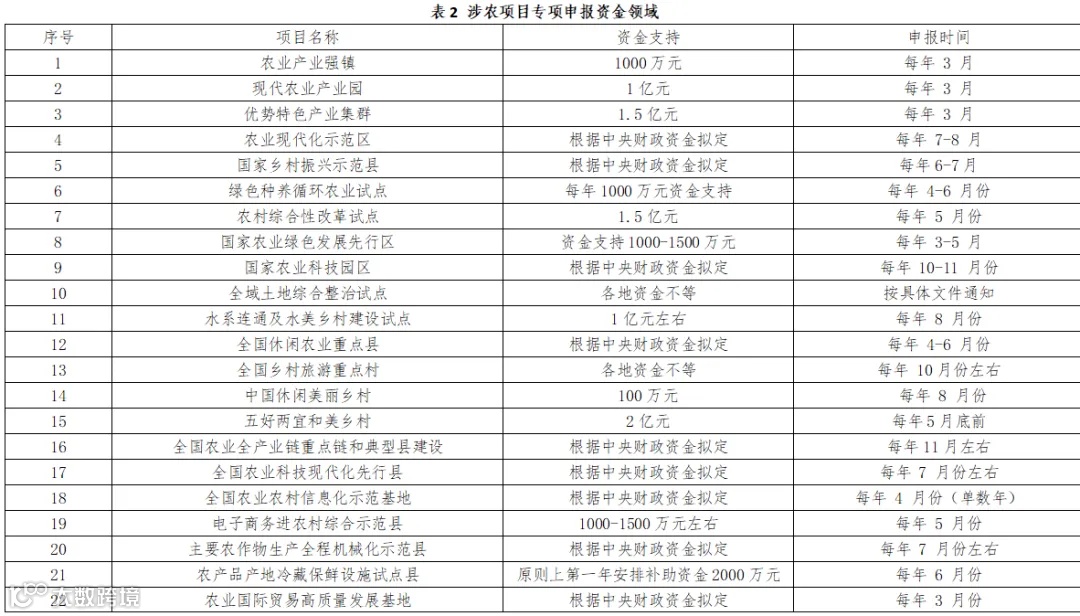 重大农业专项主要以农业部及相关部委扶持的重大项目为重点,项目谋划方向为农业产业强镇、现代农业产业园、优势特色产业集群、农业现代化示范区、国家乡村振兴示范县、绿色种养循环农业试点、农村综合性改革试点、水系连通及水美乡村建设试点、农村产业融合发展示范园等项目。