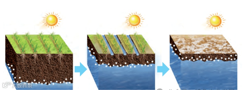 由于人们不合理抗旱,采用大水漫灌,再加上气候干燥等因素,使得大部分水分短