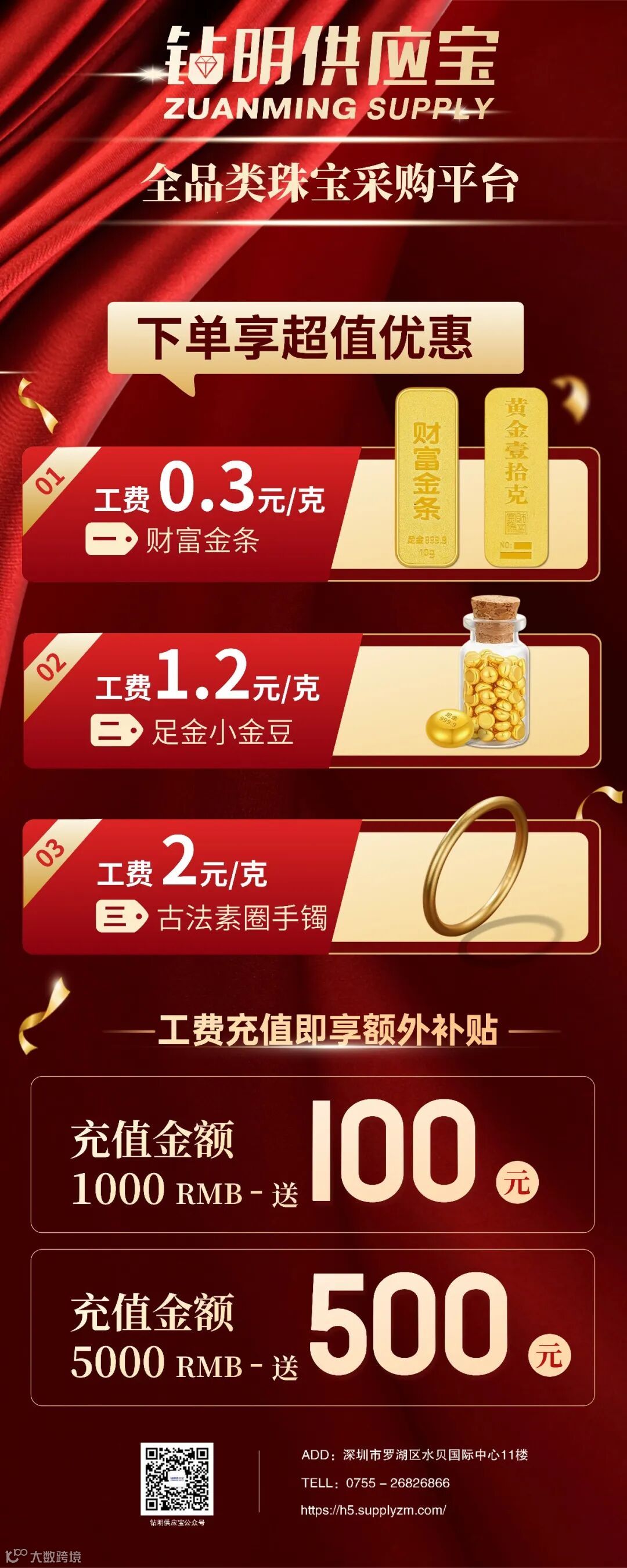 钻明供应宝新用户工费立减50元,工费最高充5000送500,源头工厂,超低工费,优惠享不停!
