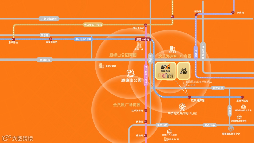 顺控漫华里项目坐落于顺德大良新城核心区域,总建筑面积约11万平方米,具备良好的区位条件。项目紧邻华侨城欢乐海岸PLUS与顺峰山公园,周边覆盖佛山地铁3号线(已运营)与13号线(规划中)双地铁线路,并结合城轨及主干道形成立体交通体系;三公里范围内涵盖多个高品质住宅区。其优越的地理位置,有助于吸引本地居民、游客以及跨区域消费人群。