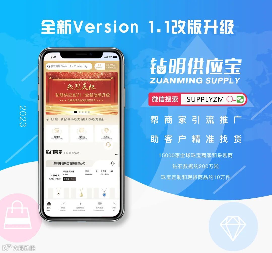 钻明供应宝在用户反馈中,推出v1.1升级版,平台运营一年多,聚集了15000家全球珠宝商家和采购商,拥有200万粒钻石数据和约10万件珠宝定制和现货商品数据。我们助商家引客引流,提升订单量;同时也成功服务数万单客户订单,解决采购商烦恼。