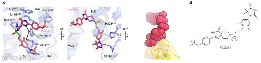 PCO371结合于TM2、TM3、TM6和TM7形成的胞内信号转导蛋白结合口袋中 (图2,图3),而非正构位点,这在过去已发表的B1类GPCR与激动剂结合的结构中还从未被观察到过。PCO371与该位点的相互作用绝大部分由范德华力和疏水相互作用介导,Tyr4597.57与Val4126.44以及PCO371之间形成的氢键进一步稳定了整个复合物。值得注意的是,PCO371的DMH (dimethylhydantoin) 基团与Gαs C端hook结构相互作用,将PCO371紧包裹在受体核心内。该结构足以清晰表明PCO371是一种结合于Gs和受体胞内腔的激动剂。