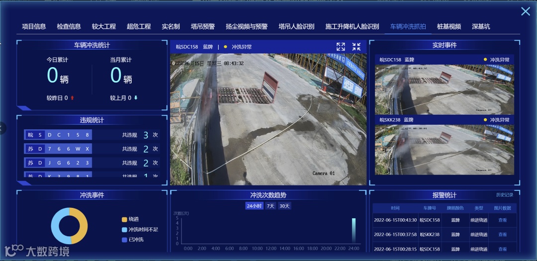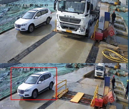 云服务端接收到从设备端采集到的数据,结合AI算法及分析技术——>识别出正常冲洗和违规离开的车辆信息、图像数据等——>将违规数据上报给智慧工地监管平台