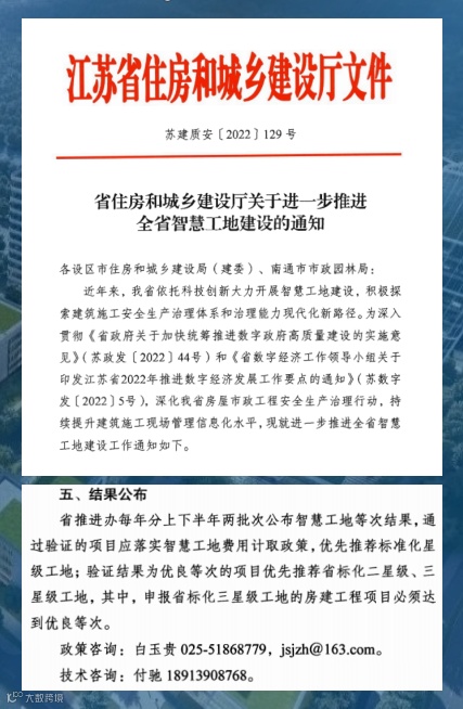 最新通知!省住房和城乡建设厅印发《关于进一步推进全省智慧工地建设的通知》苏建质安(2022)129号文,持续推进十项重点任务,并根据智慧工地项目评分表开展评分,划分出“不合格、合格、良好和优良”四个等次。
