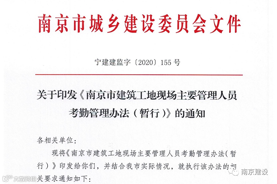 打卡是很多白领的上班必修课,以后这也将成为南京建筑工地现场主要管理人员的日常。5月7日,现代快报记者从南京市建委获悉,市建委近日印发《南京市建筑工地现场主要管理人员考勤管理办法(暂行)》(以下简称《管理办法》),推进建筑工程施工现场主要管理人员到场履职,实现联动管理,保障工程质量和安全。据悉,南京市行政区域内新开工的房屋建筑工程今年7月1日起执行,7月1日之前已开工的房屋建筑工程鼓励参照执行,市政基础设施工程、轨道工程、装饰装修工程自2021年1月1日起执行。