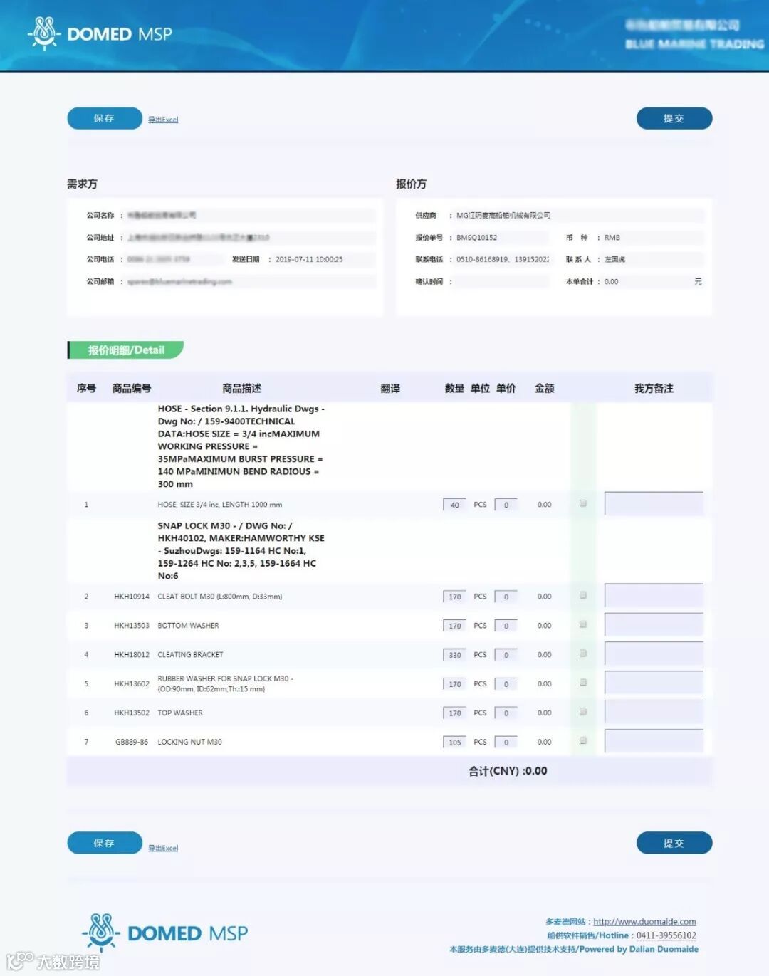 MSP集业务和财务于一体,专为船供企业量身定做,船东询价一键导入,供应商邮件报价,价格自动匹配、筛选。适用于所有大中小型船舶服务企业。平台功能全面,流程规范,价格低廉,操作页面简洁易懂,大量节省报价员电话询价的时间和成本,并可根据用户操作习惯不断完善系统,使操作更加舒适效率。