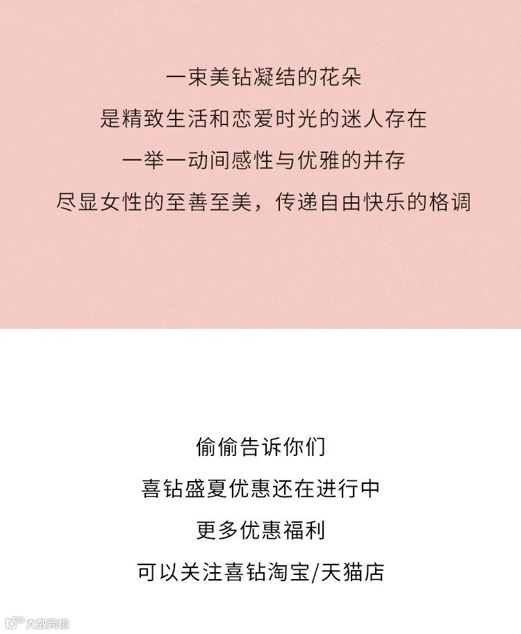 喜钻,以创新思维、不凡基调设计出玩味的作品,传递喜悦生活的态度,为珠宝注入幸运精髓,品牌理念 喜悦生活·幸运喜钻