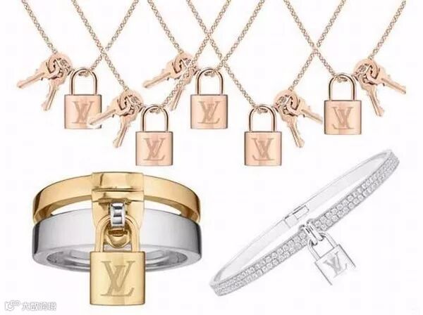 路易威登(Louis Vuitton)推出了以“lockit”手袋为原型的锁扣造型元素的珠宝,锁把装饰的手镯、项链,配上玫瑰金、金色、银色的光泽,奢华中满载浪漫情怀。
