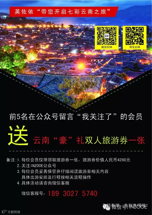 限5名在公众号留言“我关注了”的会员送英佐依价值4260元云南双人旅游券一张