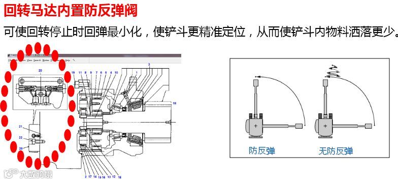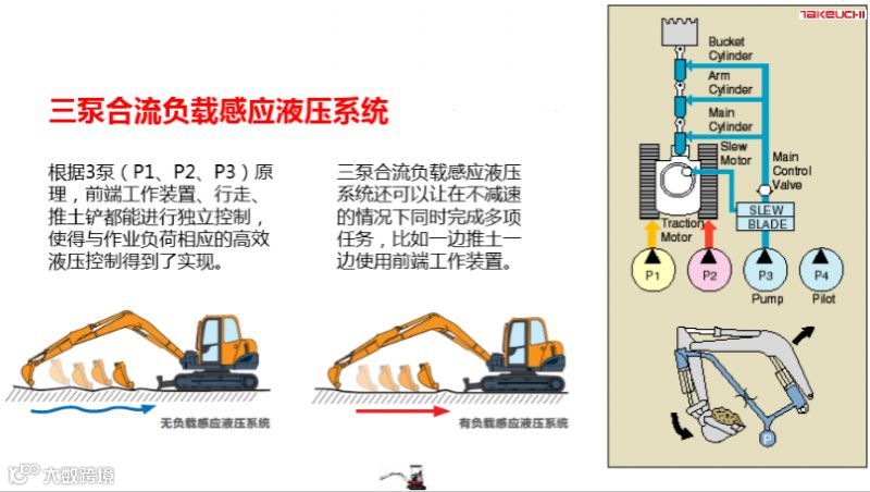 新技术的采用,使同时互不干涉的进行工作装置与行走作业成为可能。即使同时操作两个工作装置时仍可保证机器正常速度的直线行走。如动臂、斗杆、铲斗加行走作业。