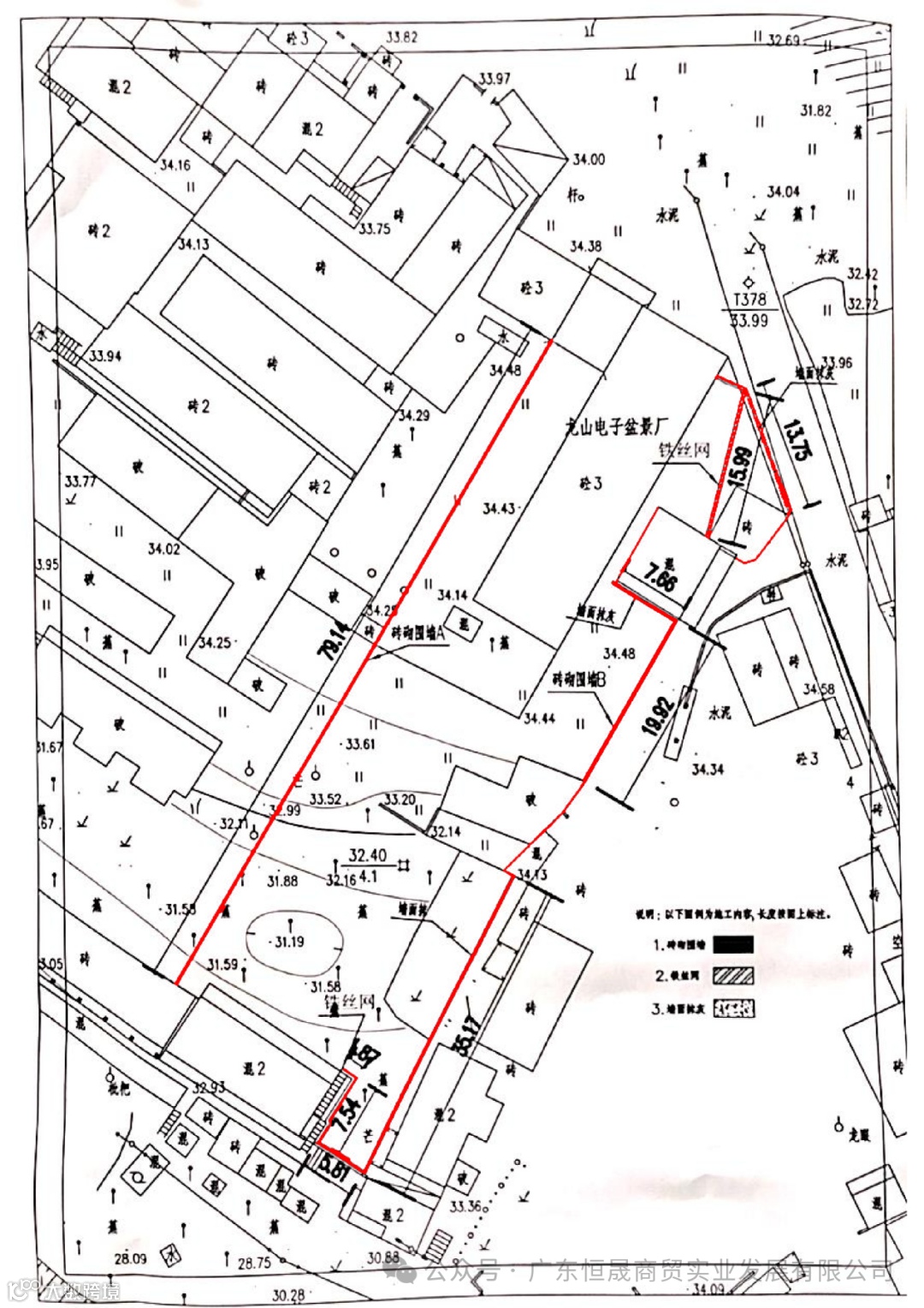 (五)工程内容:根据英德仓库土地四至范围对上述物业修建围墙,工程内容包括平整场地、挖沟槽土方、回填方、余方弃置、砌石基础、砌筑工程、墙面抹灰、开门洞、墙上加装刺网等(建墙范围情况见附图及工程清单)。