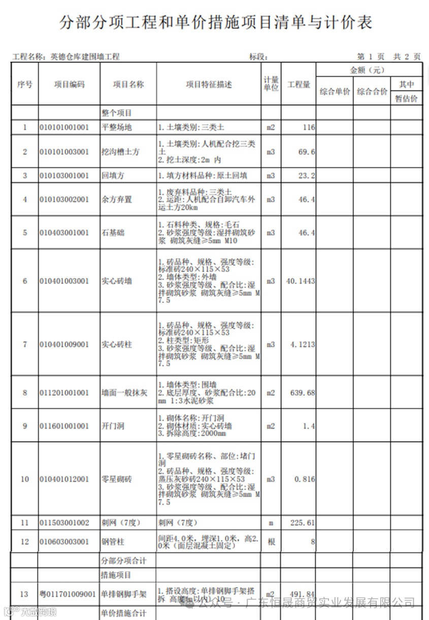图3:新建围墙工程量清单