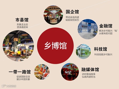 乡村振兴博览馆主体以市县馆为核心,分为市县馆、国企馆、金融馆、科技馆、融媒体馆、一带一路馆等六个功能分区。