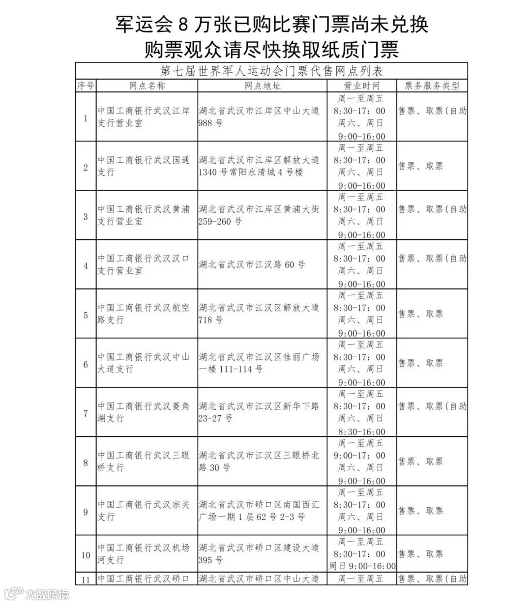 武汉军运会比赛门票销售火爆,但换票行动却较为迟缓,目前仍有8万多张官网预订比赛门票的观众尚未换取纸质门票。为避免观众取票不及时影响入场观赛,武汉军运会执委会提示尚未换取纸质门票的观众,请最迟于各项目开赛前1天到湖北省工商银行各代售网点及大麦网代售网点,凭预订时收到的取票码到各代售网点换取纸质门票(各代售网点地址附后)。