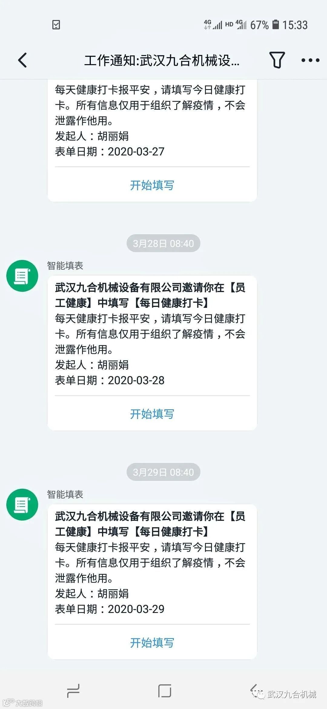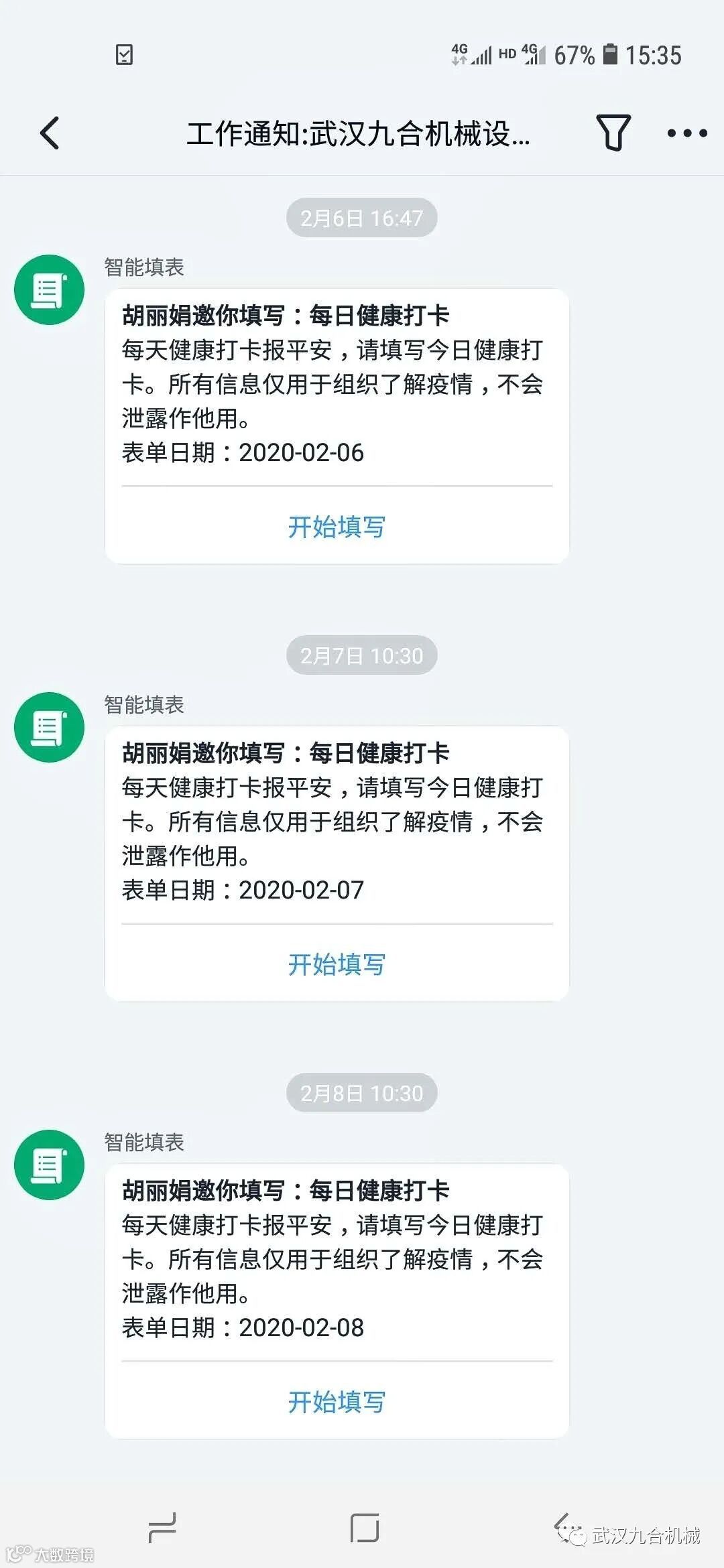2月6号全体员工钉钉每日健康打卡,一直持续到复工前。目前九合的所有员工均无感染,都遵守了当地的防疫隔离制度。