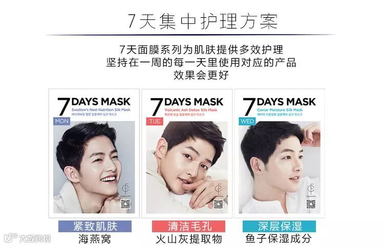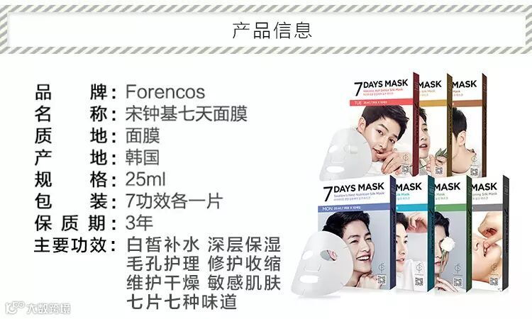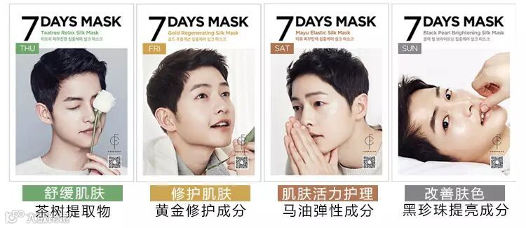 俗称“老公面膜”的这款七天面膜贴是Forencos推出的七种功效的面膜贴,加上包装上以宋仲基头像印制,上市后很多人购买宋仲基很懂美容护肤,也在节目中大谈过自己的护肤秘诀,他的皮肤也是非常不错。这款7 DAYS MASK以一个星期为周期,打造7天新理念护肤,每天都有不同体验。