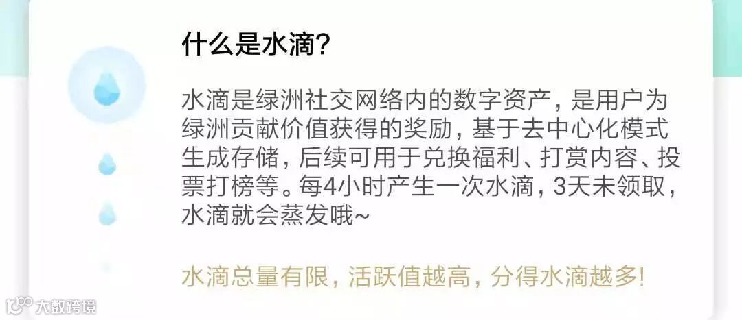 「水滴」是绿洲社交网络内的数字资产,是用户为绿洲贡献价值获得的奖励,基于去中心化模式生成存储,后续可用于兑换福利、打赏内容、投票打榜等。每4个小时产生一次水滴,3天未领取,水滴就会蒸发。而且,官方特别注明:“水滴总量有限,活跃值越高,分得水滴越多。”