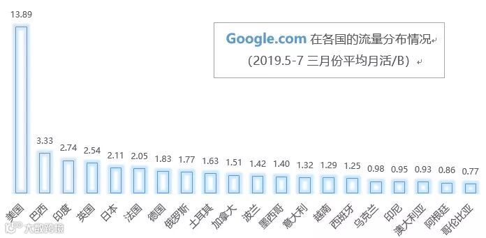 同样借助了Similarweb来获取Google.com在各国的流量分布情况,TOP20国家如下:(中国因屏蔽Google,并未排在TOP20)