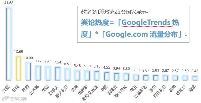 在此,笔者将「BTC词条在各国的搜索热度」定义为各国「GoogleTrends热度」与相应国家的「Google.com流量分布」之积。其反应的数字货币舆论热度排行如下图所示。