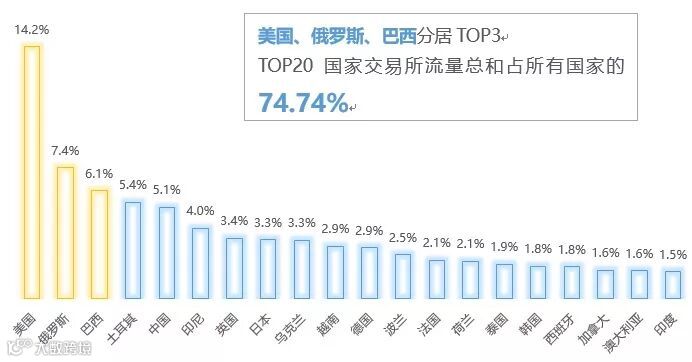笔者基于上述交易所选型分析了交易所的整体流量在各个国家的分布情况。交易所流量TOP20国家如下图所示,美国、俄罗斯、巴西分列TOP1-3,土耳其、中国、印尼、日本紧随其后。TOP20国家交易所流量总和占所有国家总流量的76.17%。