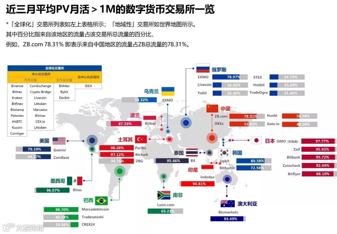 上图中,笔者还对入选的交易所进行了「地域性」和「全球性」划分。划分依据如下:从整体活跃度排名来看,发现TOP1美国活跃度占全球不足15%,因为交易热度权重占到70%,所以整体市场活跃度排名很大程度上由交易热度来决定,在下文中的交易热度排名,也验证了此点——TOP1国家占总交易热度<15%,因此我们判定如果交易所自身流量来自于某个国家>20%,即视其为「地域性」交易所,反之则视其为「地域性」交易所。