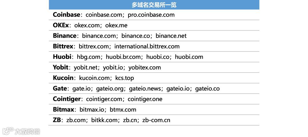 此外,为统计数据尽量客观,除主网站之外,笔者还同时兼顾了Web端的多个域名,涉及多个域名的交易所如下: