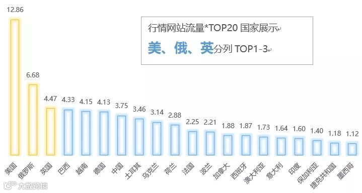交易热度之交易所流量分布情况——美俄巴分列TOP1-3位,中国位列第5。英国、越南、德国、法国、荷兰、西班牙和加拿大没有强势的本土交易所,并且流量也较为可观,可重点开拓。