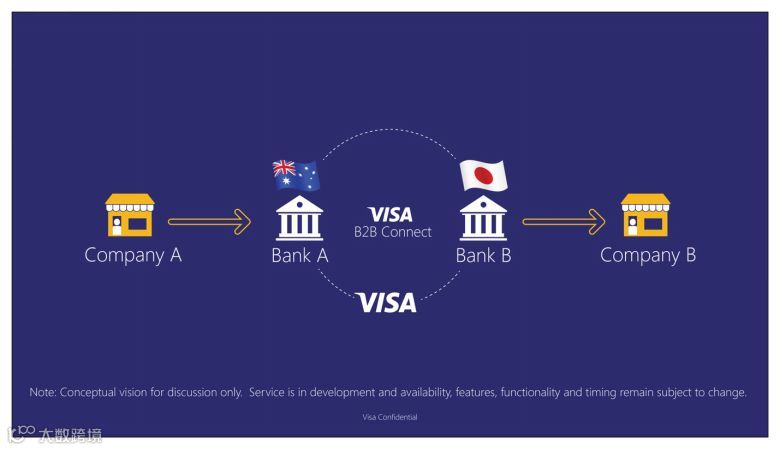 ViSA的区块链支付项目起于于2016年10月。ViSA B2B Connect在2017年11月首次在试点阶段推出,以测试银行对银行的连接。现在已经在30个市场推出,计划在2019年底前扩展至90多个地区。这会挑战了SWIFT跨境支付的市场。