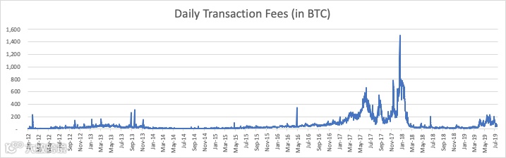 除了2017-18年12个月期间的交易费用飞涨外,下表显示,比特币日常交易费用一般保持在200 BTC以下。2019年,比特币网了每日交易费用平均约为70 BTC。显然,交易费用也显示出与比特币价格的强相关性(费用与币价呈正相关波动)。