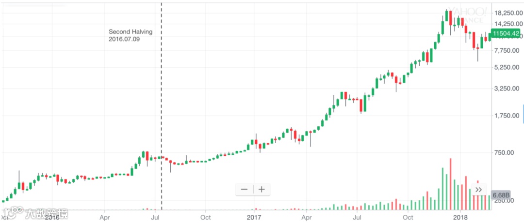比特币价格在2015年11月开始大幅上涨,这开启了第二个减半价格周期,这距离2016年7月的正式减半大概提前了8个月的时间。在减半正式发生后,比特币继续上涨,整个周期与前一次一样大约持续了24个月,直到2017年12月达到了19000美元的历史新高。
