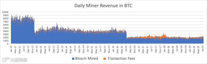 接下来,我们把区块奖励和交易费用放到一起,然后全面地了解矿工收入,以及他们可能引入的每日边际供应。新开采的比特币在历史上一直是矿业收入的主要来源。即使在今天,每天平均70 BTC的交易费用与每天2000 BTC的新增供应量相比仍然是很少的。然而,随着交易量的上升和大宗回报的减半仍在继续,交易费用成为收入的主要来源,仅仅还需几年的时间。