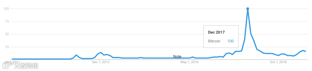 下面的图表,是谷歌趋势所展示出的人们对比特币的兴趣变化。比特币搜索量最大的时间点是在2017年12月,当时比特币的价格创下了历史新高。2013年12月的搜索兴趣峰值也与此前的历史高点一致。而最近,随着比特币价格的继续上升,其搜索兴趣又开始上升。