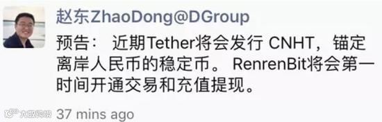 根据国外区块链媒体Coindesk报道,比特币早期玩家、DGroup创始人、Bitfinex股东赵东宣称:“近期Tether将会发行锚定离岸人民币的稳定币CNHT,其货币储备将由一家比利时银行负责进行,RenrenBit将会第一时间开通交易和充值提现。”赵东对Coindesk表示,他相信新的稳定币将“很快就将推出”,“可能就在几周内”。